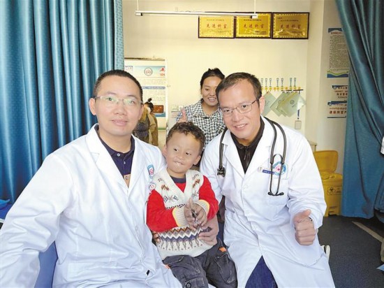 援藏醫(yī)療隊(duì)廖森成醫(yī)生與前來(lái)篩查的兒童合影。