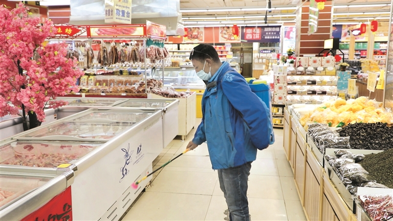 圖為超市工作人員對冷凍生鮮食品區(qū)進(jìn)行消毒殺菌工作。記者 拉珍 攝