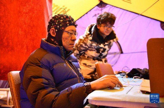 在卓奧友峰登山大本營,中科院院士朱彤佩戴全腦彈性測(cè)試帽,測(cè)試人體認(rèn)知能力(10月1日攝)。新華社記者 晉美多吉 攝