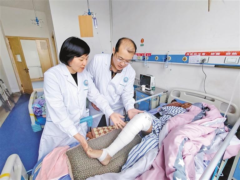 青島市市立醫(yī)院援藏醫(yī)生徐文龍(右)指導患者進行術后康復訓練。青島援藏干部王建亮提供