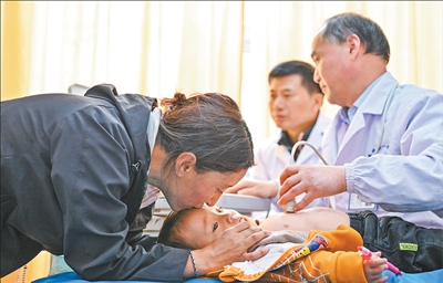 西藏山南市措美縣中心醫(yī)院,來(lái)自安徽醫(yī)科大學(xué)第一附屬醫(yī)院的醫(yī)生在為兒童做先心病篩查。程 兆攝(影像中國(guó))
