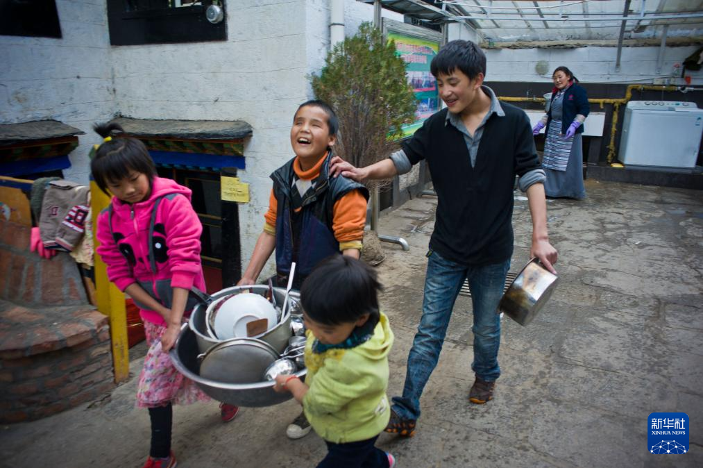 2013年10月12日,達瓦次仁(左二)跟同學(xué)們將洗好的餐具抬回廚房。