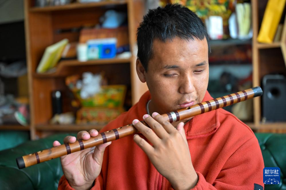 2025年10月10日,達瓦次仁在練習(xí)吹奏笛子。