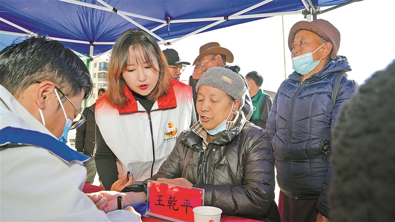 為進(jìn)一步深化社區(qū)養(yǎng)老服務(wù)體系建設(shè),切實(shí)回應(yīng)老年人的健康關(guān)切,近年來,城關(guān)區(qū)奪底街道桑伊社區(qū)聚焦重點(diǎn)服務(wù)群體,創(chuàng)新探索“黨建引領(lǐng)+志愿服務(wù)+專業(yè)醫(yī)養(yǎng)”三位一體助老服務(wù)新模式,取得良好成效。圖為三沐醫(yī)養(yǎng)專業(yè)人員與桑伊社區(qū)“布谷響鈴”志愿者協(xié)同配合,為轄區(qū)老年人免費(fèi)開展健康指標(biāo)監(jiān)測(cè)。記者 鹿麗娟 攝