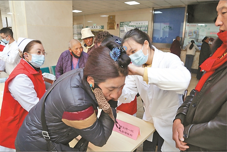 圖為醫(yī)療隊(duì)專家為患者做耳部疾病檢查。記者 貢秋曲措 通訊員 梁俠 潘樹仁 攝