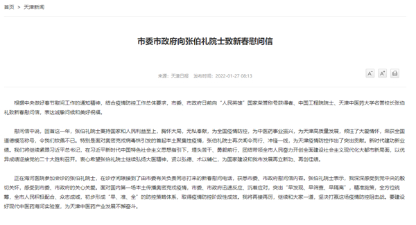 天津市委市政府向張伯禮院士致新春慰問(wèn)信:胸懷大局,無(wú)私奉獻(xiàn)