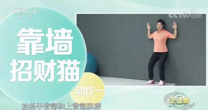 如果出現(xiàn)五點不能完全緊貼墻面的情況,說明可能出現(xiàn)了含胸駝背的現(xiàn)象,這個時候我們可以通過“靠墻招財貓”的動作,強化背肌力量,改善駝背體態(tài)。