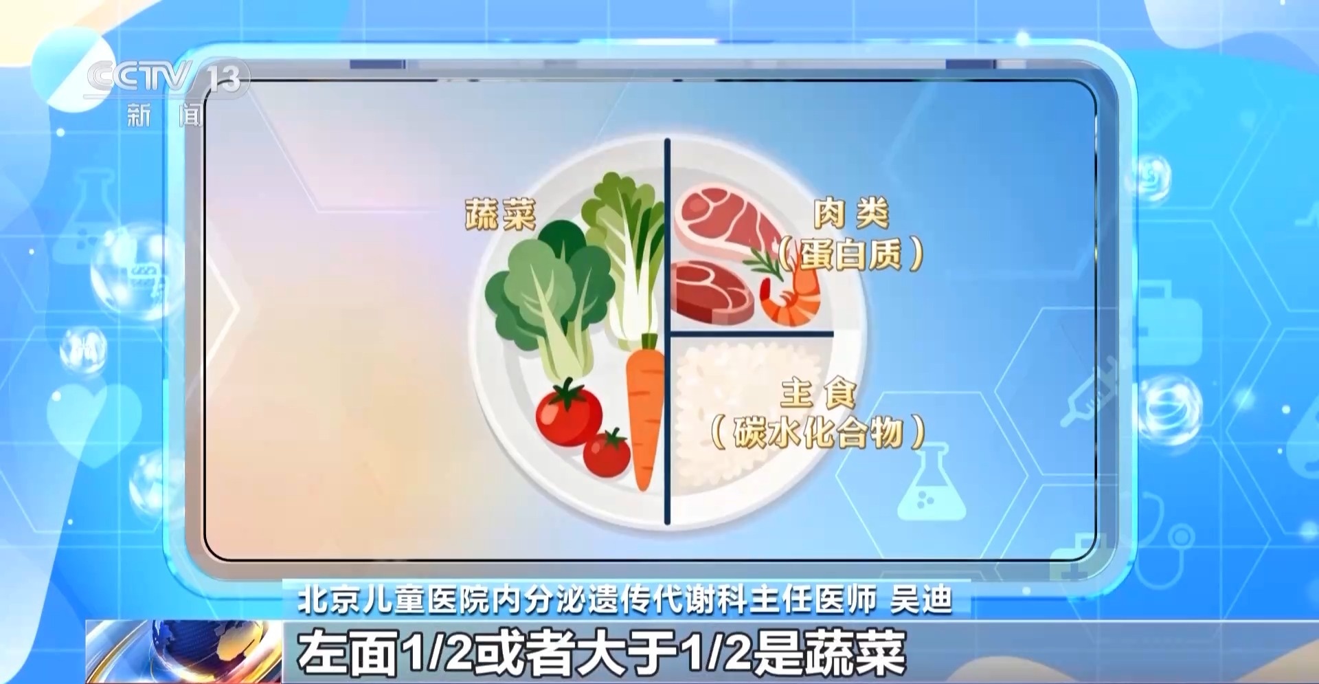 北京兒童醫(yī)院內(nèi)分泌遺傳代謝科主任醫(yī)師 吳迪:早上要吃飽,開啟一天的生活元?dú)鉂M滿,中午要吃好,營(yíng)養(yǎng)要均衡搭配,晚上要吃得早一些,吃得少一些,睡覺前2到3個(gè)小時(shí)不建議進(jìn)食。一般情況下一個(gè)圓盤子,可以中間畫一條線,左面1/2或者大于1/2是蔬菜,右側(cè)上面1/4是蛋白質(zhì),右側(cè)下面1/4是主食。