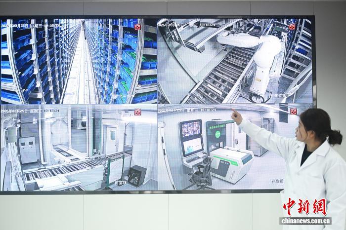 3月26日,在位于甘肅省定西市隴西縣的國家藥用植物種質(zhì)資源庫甘肅庫智能庫內(nèi),工作人員通過屏幕展示自動化存取設(shè)備存取種子過程?!±顏嘄?攝