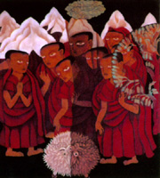 與傳統(tǒng)相比,兼收并蓄、博采眾長(zhǎng)、百花齊放是20世紀(jì)和21世紀(jì)西藏畫(huà)壇發(fā)展的潮流。藝術(shù)家們不僅從西藏古老的流派中吸收豐富的營(yíng)養(yǎng),同時(shí)還學(xué)習(xí)國(guó)畫(huà)和油畫(huà)的技法,從而在不失傳統(tǒng)特點(diǎn)的基礎(chǔ)上大大豐富了西藏繪畫(huà)的外延和內(nèi)涵,使西藏繪畫(huà)更加煥發(fā)出迷人的魅力。如門(mén)塘著名的畫(huà)家唐拉次旺,在師從門(mén)塘派著名大師嘎托司徒卻吉嘉措、昌都的普林次仁和欽孜派大師學(xué)習(xí)門(mén)塘和欽孜派畫(huà)法,還學(xué)習(xí)外國(guó)油畫(huà)的一些技法。并且按照國(guó)畫(huà)風(fēng)格繪制了一套十六羅漢的組畫(huà)和一幅表現(xiàn)著名高僧米拉日巴的水墨畫(huà),同時(shí)按照油畫(huà)風(fēng)格創(chuàng)作了一幅八蚌司徒白瑪旺卻杰波的肖像。