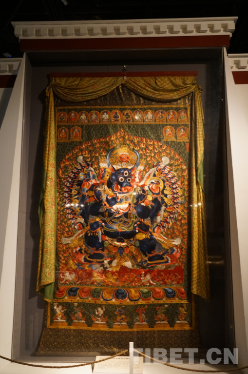 展覽專辟了一個(gè)區(qū)域展示西藏唐卡畫的發(fā)展衍生。其中,有一幅明永樂年間的刺繡大威德金剛唐卡堪稱“明星展品”。這幅高約4.3米的唐卡針線細(xì)膩,色彩鮮艷,造型生動,為密針疊線繡制手法。