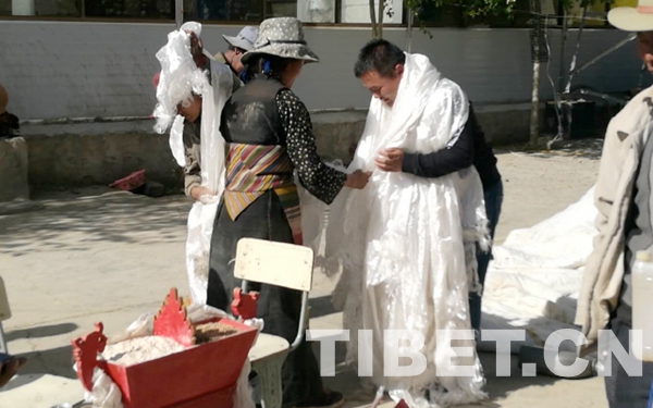 圖為村民為兩臺(tái)設(shè)備獻(xiàn)哈達(dá)。