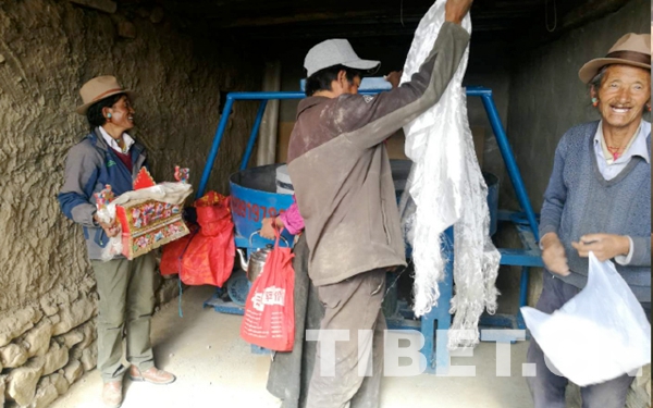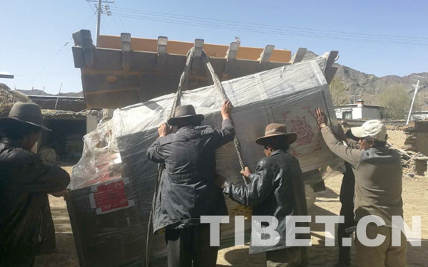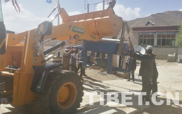 圖為青稞加工設(shè)備運(yùn)抵拉龍村。