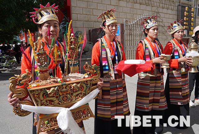 山南民眾代表手捧象征吉祥如意的“切瑪”,用傳統(tǒng)禮節(jié)歡迎十一世班禪。攝影:王淑
