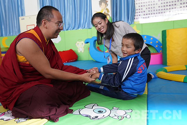 “喜歡這份工作嗎?”“愿意做這份工作嗎?”在康復(fù)區(qū)參觀調(diào)研時,十一世班禪仔細(xì)詢問老師們的工作情況并對他們說:“你們在這里為這些殘障的孩子奉獻(xiàn),很了不起,向你們致敬?!?/p>