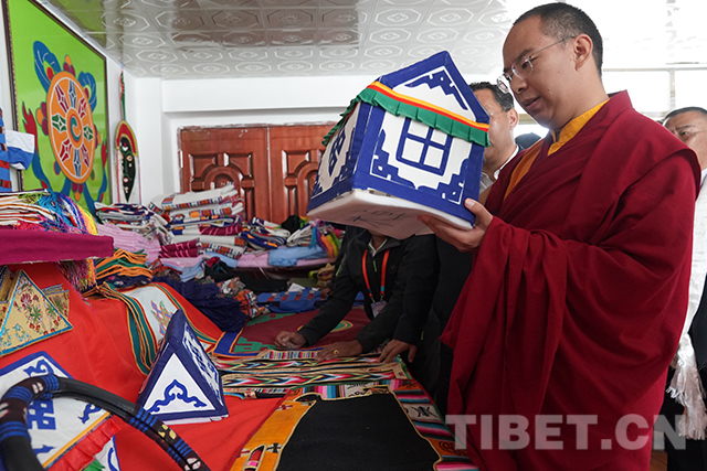 十一世班禪仔細(xì)觀看學(xué)校殘疾人職業(yè)教育中心里的作品。攝影:王淑