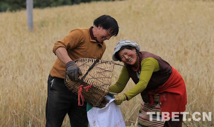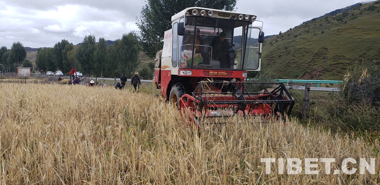 洛絨登巴家有10畝承包地,秋收成了大問題。過去秋收,家家都是人工手割,一人累了一天也割不了1畝地,耽誤農(nóng)時(shí)不說,還影響收成。像青稞麥類農(nóng)作物,太陽一曬,青稞崩落地了。像他家這么多的土地,用人工根本收不過來。甲洼鎮(zhèn)政府現(xiàn)擁有2臺(tái)聯(lián)合收割機(jī),收割、脫粒、裝袋三道工序一次完成!過去得10多人收一周時(shí)間的地,現(xiàn)在兩小時(shí)便搞定了,而且做到了顆粒歸倉、秸稈還田!秋收時(shí)節(jié),整片地里,聯(lián)合收割機(jī)像技藝精湛的畫家,隨心所欲、胸有成竹、瀟灑自如地在壟間地頭揮毫!片片莊稼倒下后,袋袋糧食裝上拖拉機(jī)……那場(chǎng)面,甚是宏大而喜人!連洛絨登巴的岳母大人目睹秋收?qǐng)鼍昂?,也不由感慨地說:“這一眨眼的工夫,糧食已從田間送進(jìn)倉了,簡(jiǎn)直像變戲法一樣!”