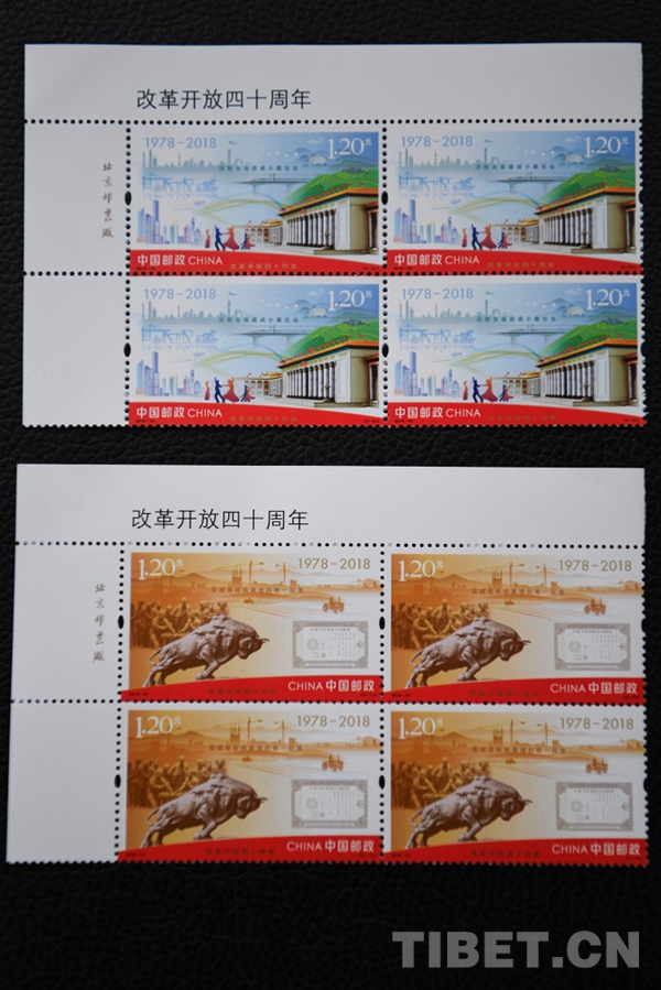 圖為此次由中國郵政發(fā)行的《改革開放四十周年》紀(jì)念郵票。