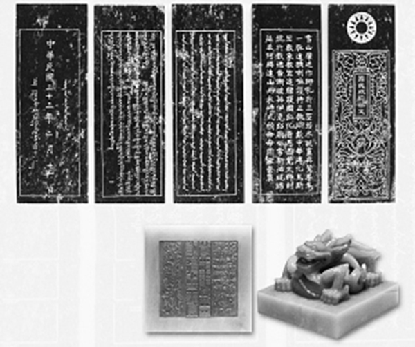 謝國梁奔波于藏事,為中央政府與西藏地方關(guān)系的恢復(fù)發(fā)揮了橋梁作用。圖為第十三世達(dá)賴?yán)飯A寂后,國民政府追贈(zèng)其為“護(hù)國弘化普慈圓覺大師”的稱號(hào),并頒發(fā)玉冊(cè)、玉印。圖片來源:人民網(wǎng)—西藏頻道。