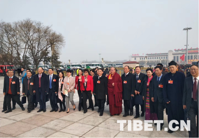 圖為全國(guó)政協(xié)委員達(dá)扎?尕讓托布旦拉西降措與其他全國(guó)政協(xié)委員一起入場(chǎng)