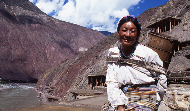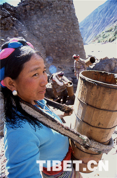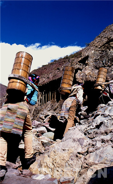 鹽田里的事自古就是由女人操持的,按她們的解釋是因?yàn)槟腥舜中?,會弄臟了白花花的鹽,賣不出好價(jià)去。所以男人就負(fù)責(zé)運(yùn)輸和銷售工作,他們會在女人已經(jīng)曬出小山樣的一堆鹽巴時,趕著騾馬來把鹽馱走,然后跋山涉水到巴塘、德欽、昌都一帶,換錢糧或者茶葉。而女人就用自己的雙肩背起水桶,下到陡峭的江邊汲水,再沿著細(xì)小的棧道背到用木支架撐起的鹽田里,等無數(shù)桶鹵水將鹽田灌滿后,剩下的就是盼著陽光和風(fēng)快快將水分蒸干,第二天就可以收獲了。她們就這樣日復(fù)一日年復(fù)一年地將狹窄的山路踩踏了千萬遍。