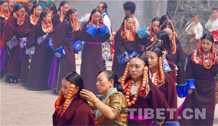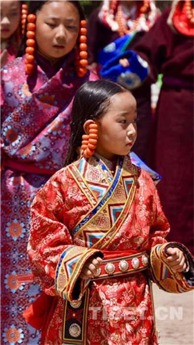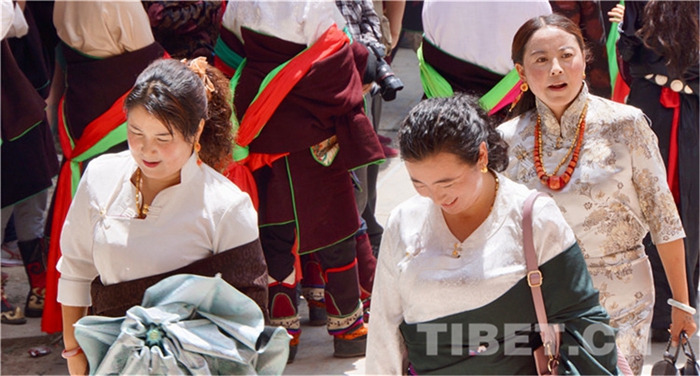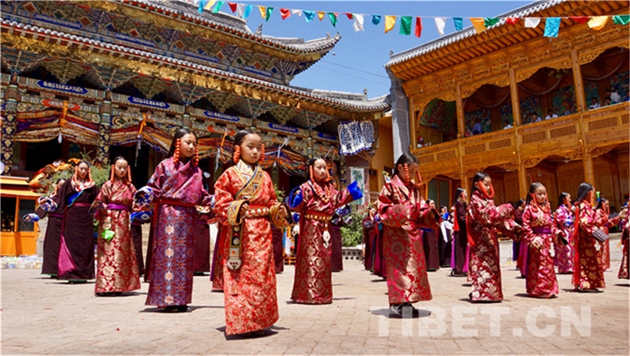 六月會(huì)期間有多場(chǎng)舞蹈表演,參與者是年輕的未婚女子,她們穿上最隆重的藏袍,綴上珊瑚蜜蠟松石銀飾,精施粉黛,莊重優(yōu)雅地舉手抬步緩行。舞蹈的動(dòng)作簡單緩慢,但是女孩子們個(gè)個(gè)奪目。