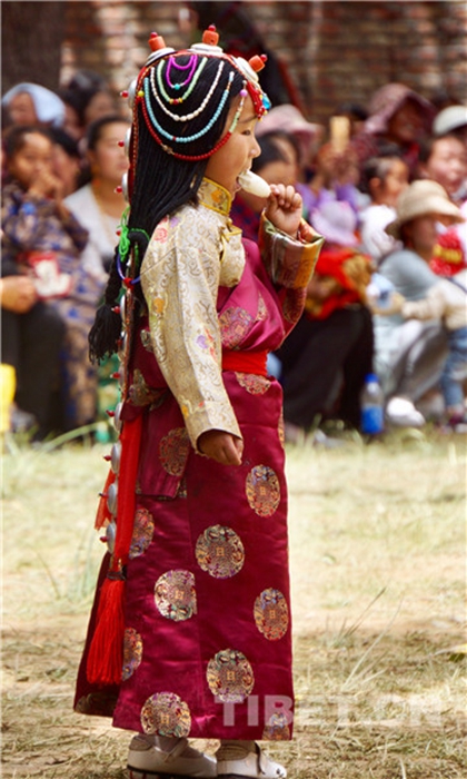 幼年的女孩和已婚女性、老年婦女皆是場(chǎng)外的觀眾,但是也都是精心裝扮、身著藏裝藏飾,美得含蓄而沉靜。我的眼睛不時(shí)地被她們的光彩照亮。