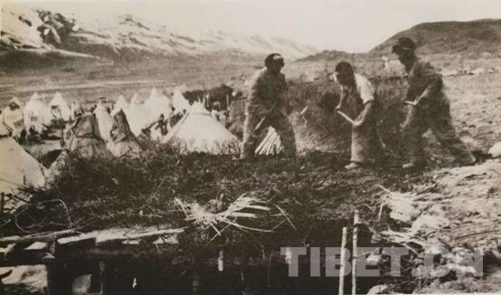 隨后,根據(jù)領(lǐng)導(dǎo)指示,各大隊(duì)沿山坡兩邊挖掘坑洞。4月的甘孜,有些凍土還沒(méi)化,必須先點(diǎn)燃草根將土層凍土融化,才比較好挖土地。接著是準(zhǔn)備修建窯洞所需的“建筑材料”,到離宿營(yíng)地?cái)?shù)十里外的山林里砍樹。用這些木材鋪?lái)?,上面鋪上帳篷布,再堆上泥土。這樣建成的窯洞,倒也冬暖夏涼。修建窯洞群的戰(zhàn)士們頗為自豪地稱其為“康藏大廈”。