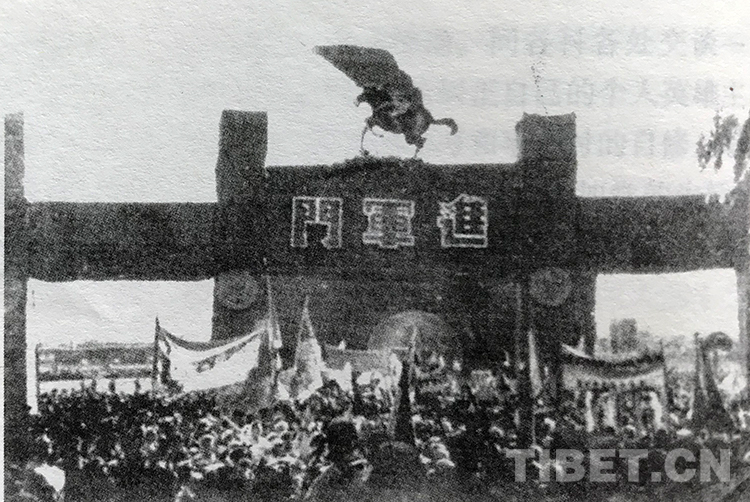 下午四點(diǎn),部隊(duì)開始進(jìn)入進(jìn)軍西藏誓師大會(huì)會(huì)場。進(jìn)軍門上方,一旗、一人、一馬,士氣高昂、整裝待發(fā);進(jìn)軍門前,打著紅綠標(biāo)語的各界人士和群眾高呼著:“進(jìn)軍西藏,你們走到哪里,我們支持到哪里!”整整兩萬人的部隊(duì)和群眾陸續(xù)通過特意布置的進(jìn)軍門進(jìn)入布滿紅色標(biāo)語的三蘇公園。