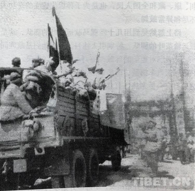 魏克在日記中寫道:“滿載著進(jìn)軍英雄們的車隊(duì),被沿途歡送的人群包圍起來了,許多青年男女跑上來,在汽車上貼滿了紅綠標(biāo)語,送上一碗碗茶水,將一把把香煙撒在車廂上,鮮花、紙花、小旗子插滿了車的四周。‘祝你們旗開得勝,馬到成功’和‘迅速解放西藏人民’的口號(hào)聲此起彼伏、響徹云霄。汽車慢慢地從一個(gè)個(gè)彩門下通過,被歡呼的群眾送了一程又一程?!?/p>