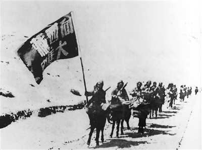 次日,當東方剛剛發(fā)白,先遣隊便開始了攀登大冰山的戰(zhàn)斗。冰山上空氣稀薄,坡陡無路,騎隊攀登艱難。戰(zhàn)士們的胸口悶得發(fā)慌,心臟好像要從嘴里跳出來,頭痛得好似腦袋要開裂,馬也張著嘴喘著粗氣。有的戰(zhàn)士用手絹把頭緊緊綁住,有的拉著馬尾前進,有的倚著馬堅持邁步。高原反應嚴重者,幾乎昏迷過去,體質(zhì)較強的同志攙扶著體弱的。戰(zhàn)士們難受得既不能吃,也不想喝,一百多人四頓飯只吃了八十來斤糧食。