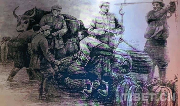 圖為甘孜人民自發(fā)捐助食、布匹。圖片翻拍于朱德總司令和五世格達活佛紀念館。