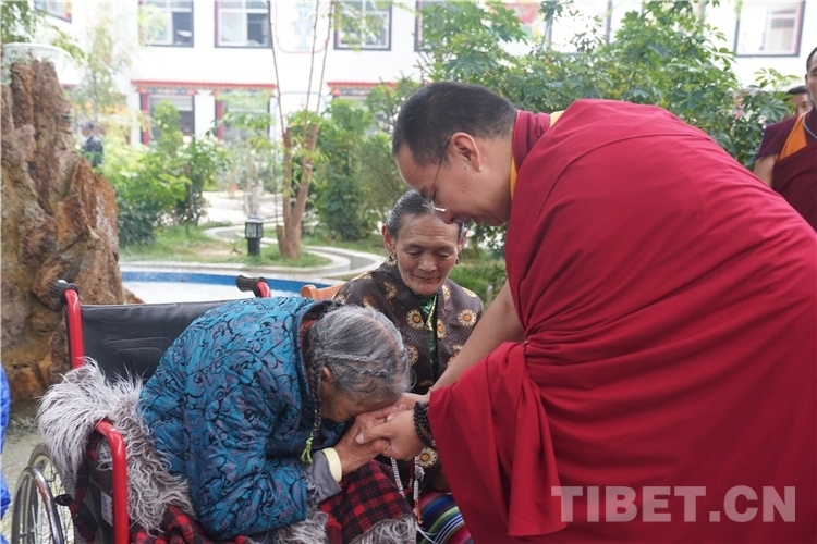 十一世班禪在參加各項(xiàng)活動(dòng)期間,專程看望阿里地區(qū)“雙集中”供(收)養(yǎng)服務(wù)中心的老人和孩子們,并為每一位老人摸頂賜福,噓寒問(wèn)暖,給老人和孩子們帶去了親人般的關(guān)懷。一位老阿媽(嬤啦)當(dāng)場(chǎng)緊緊拉著十一世班禪的手放在自己的額頭,感動(dòng)流淚,嘴里不停地說(shuō)“突吉其,突吉其”(謝謝!謝謝!)。十一世班禪和老人們圍坐在一起飽含深情地說(shuō):“在黨中央的關(guān)心關(guān)懷下,老人家弱有所扶、老有所養(yǎng)、病有所醫(yī)、住有所居,這充分體現(xiàn)了社會(huì)主義制度的無(wú)比優(yōu)越性,看到你們健康幸福的生活我很欣慰,我會(huì)為你們祈禱,我會(huì)再來(lái)看望你們。”充滿溫情的一幕使在場(chǎng)人員無(wú)不動(dòng)容。