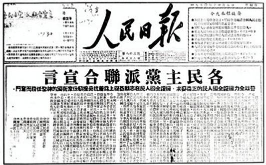 1950年11月4日,中國共產(chǎn)黨與各民主黨派發(fā)表聯(lián)合宣言:“誓以全力擁護(hù)全國人民的正義要求,擁護(hù)全國人民在志愿基礎(chǔ)上,為著抗美援朝,保家衛(wèi)國的神圣任務(wù)而奮斗?!眻D為《人民日報(bào)》刊載的《各民主黨派聯(lián)合宣言》 圖片來源:人民網(wǎng)