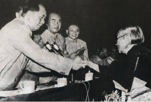 1961年7月1日,在慶祝中國共產(chǎn)黨成立40周年紀(jì)念會上,何香凝代表各民主黨派、無黨派民主人士、工商聯(lián)獻(xiàn)詞。圖為講話后,毛澤東和她握手 圖片來源:人民網(wǎng)