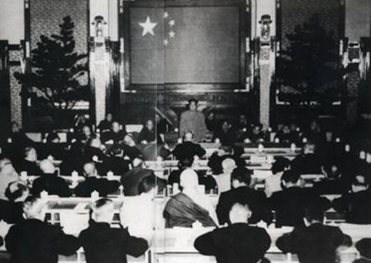1954年12月21日,全國政協(xié)二屆一次會議在京舉行。會議修改了政協(xié)章程。圖為大會主席臺。左起:郭沫若、李濟(jì)深、毛澤東、周恩來、沈鈞儒、陳叔通 圖片來源:人民網(wǎng)