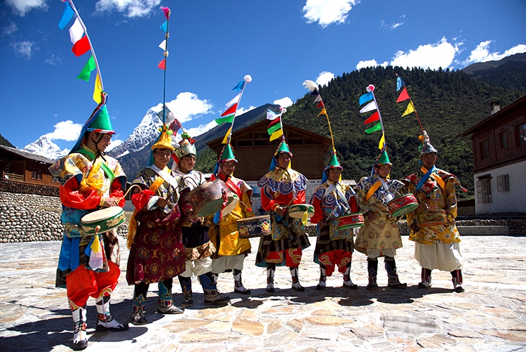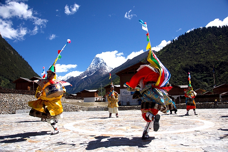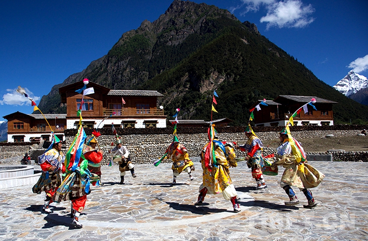 中國(guó)西藏網(wǎng)訊 伴隨著一陣整齊的鼓點(diǎn),西藏自治區(qū)林芝市工布江達(dá)縣錯(cuò)高鄉(xiāng)錯(cuò)高村的8位村民開(kāi)始了梗舞表演。他們的身后是新建成的極具工布地方特色的二層民居,更遠(yuǎn)處是巍峨聳立的杰青那拉嘎布雪山。