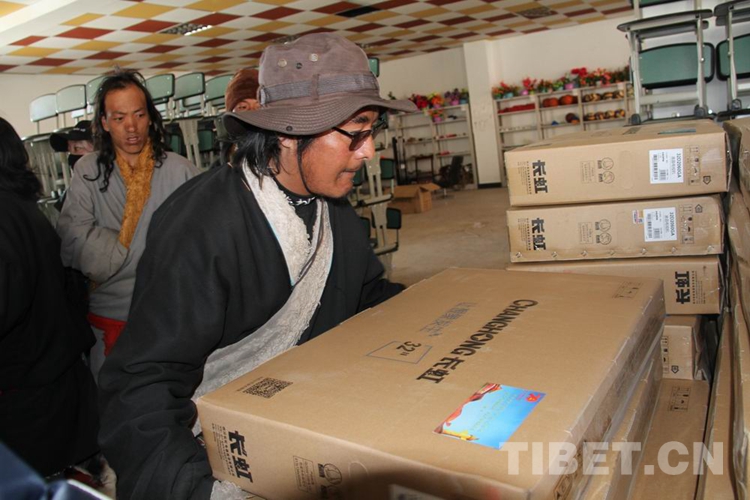 現(xiàn)場,6戶貧困戶代表上臺領(lǐng)取了電視機。嶄新的長虹液晶電視捧在手上,農(nóng)牧民群眾個個滿臉掛著燦爛的笑容?!艾F(xiàn)在路也好了、電也通了,又給我們發(fā)電視機,我們從心底感謝黨中央?。 卞`l(xiāng)受贈群眾代表多吉用藏語感激地說。