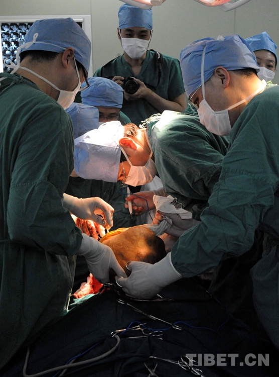2010年4月21日,北京口腔醫(yī)院口腔頜面外科醫(yī)生在實施手術(shù)。當日上午11時許,北京口腔醫(yī)院醫(yī)生為藏族婦女斯求卓瑪實施手術(shù),將其脖子上一個重達5公斤的巨大腫瘤成功切除(唐召明2010年4月21日攝)