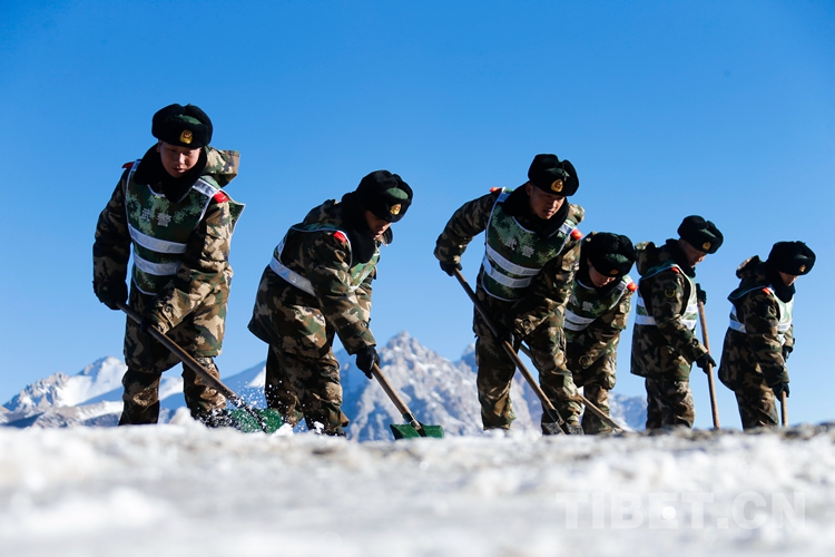 圖為官兵在川藏線然烏湖段清理路面積雪結冰