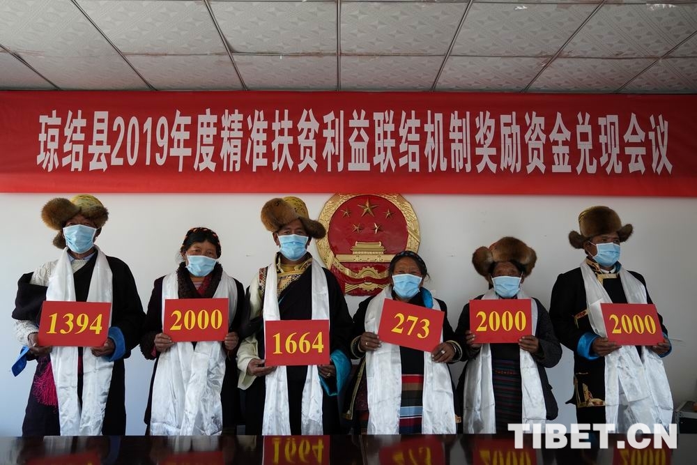 2020年3月26日,瓊結(jié)縣召開精準(zhǔn)扶貧利益聯(lián)結(jié)機(jī)制獎(jiǎng)勵(lì)資金兌現(xiàn)會(huì)議,嘎瑪旺堆作為代表參加了會(huì)議,同時(shí)拿到了2000元的獎(jiǎng)勵(lì)資金。當(dāng)時(shí)他說:“2017年11月,黨的好政策讓我們一家摘掉了貧困戶的‘帽子’。今天領(lǐng)到了縣里獎(jiǎng)勵(lì)資金很激動(dòng),感謝黨、感謝政府。”
