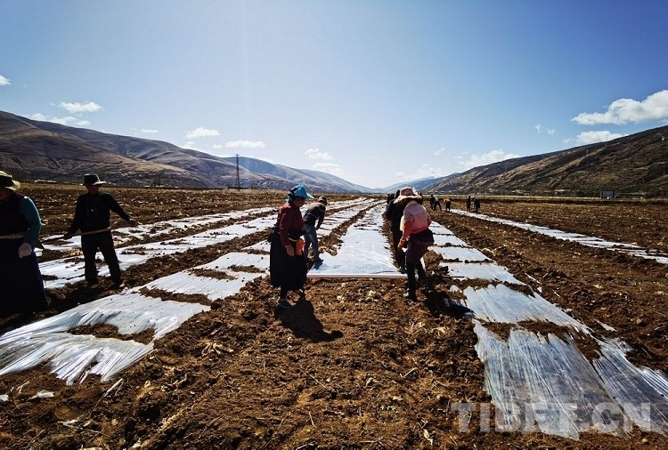 圖為優(yōu)質(zhì)飼草示范點(diǎn)正在進(jìn)行土地覆膜