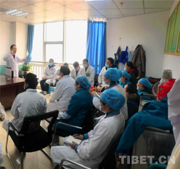 圖為李月光(左一)帶領(lǐng)昌都市藏醫(yī)院全科醫(yī)護(hù)人員業(yè)務(wù)學(xué)習(xí)