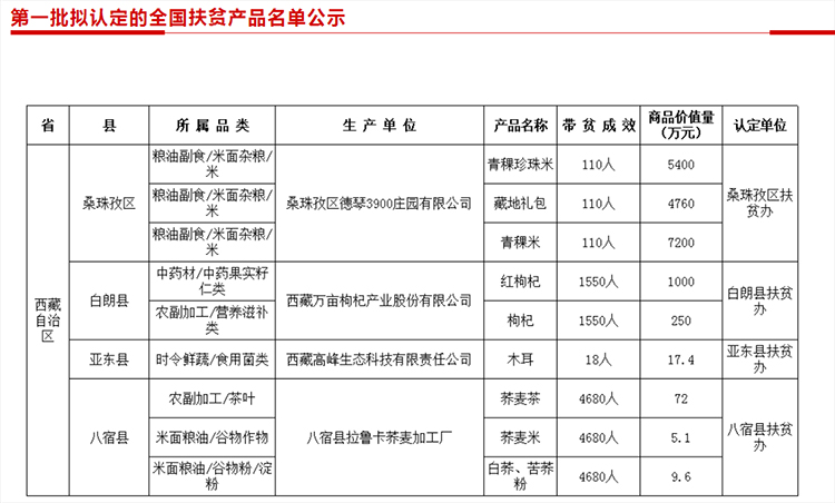 圖為第一批《全國扶貧產(chǎn)品名單》中的西藏自治區(qū)部分來源:中國社會(huì)扶貧網(wǎng)