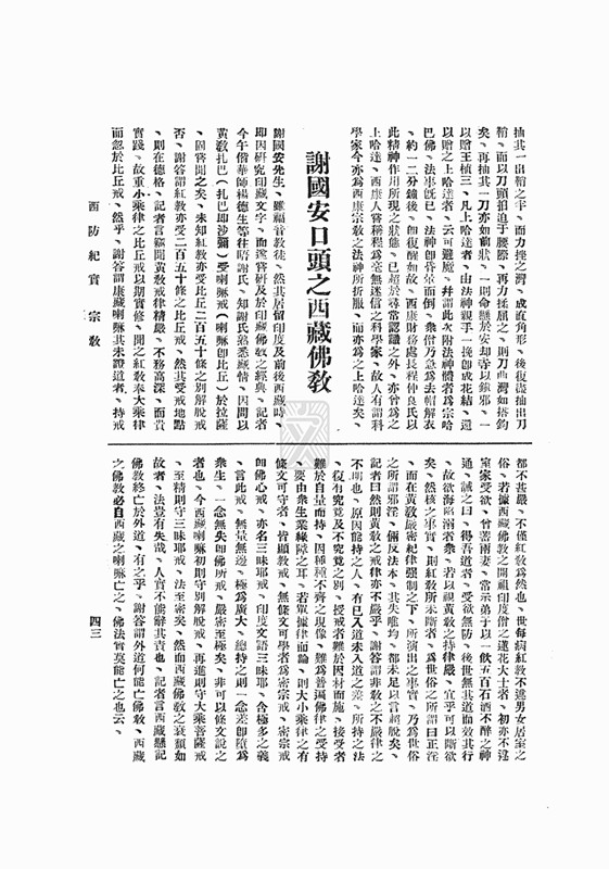 1887年,謝國(guó)安出生在今四川省甘孜縣絨壩岔。他的藏名為多吉卓巴,后因信仰基督教,取名Paul Sherap(人稱智慧保羅,我們注意到此名帶有藏文音譯),漢名謝國(guó)安。10歲時(shí),他離開(kāi)家鄉(xiāng)進(jìn)入拉薩哲蚌寺學(xué)經(jīng)。不久,謝國(guó)安離開(kāi)寺廟,跟隨藏商商隊(duì)去了錫金甘托克、印度大吉嶺的教會(huì)學(xué)校學(xué)習(xí)藏文、英文和梵文。后應(yīng)孟加拉亞洲學(xué)會(huì)之請(qǐng),到加爾各答參與校訂《藏文大藏經(jīng)·甘珠爾》。他兼通藏、英、梵三種文字,熟練地用藏、英語(yǔ)會(huì)話。辛亥革命爆發(fā)后,他返回內(nèi)地,之后定居康定。此后一段時(shí)間在康定的國(guó)立師范學(xué)校任教,主持編寫(xiě)了多部教材,如《西康國(guó)語(yǔ)教科書(shū)》(8冊(cè))、《西康常識(shí)教科書(shū)》(8冊(cè))、《西康公民教科書(shū)》等。這套教科書(shū)編輯方法,系根據(jù)教育部頒“小學(xué)課程標(biāo)準(zhǔn)”及西康特殊環(huán)境,先編漢文,再用藏文譯注,對(duì)民國(guó)時(shí)期西康教育發(fā)展和推廣起到特殊的推動(dòng)作用。他曾在西康舉辦的“縣訓(xùn)班”擔(dān)任藏文教員。當(dāng)時(shí)著名學(xué)者李思純?cè)诳刀ㄒ?jiàn)過(guò)他,印象較好,認(rèn)為他“居印度甚久,故能操英語(yǔ)等,現(xiàn)居康定,研習(xí)藏文甚深?!?938年,著名學(xué)者柯象峰到康定一帶考察時(shí),受到謝的熱情接待和幫助。他在日記里對(duì)謝國(guó)安頗有贊詞,10月9日的日記中提到“午時(shí)左右,謝國(guó)安君來(lái)訪,托其購(gòu)佛經(jīng)數(shù)部?!睅滋旌笾x國(guó)安即將“購(gòu)得之佛經(jīng)十余部一一為之譯名及指出出版處”。