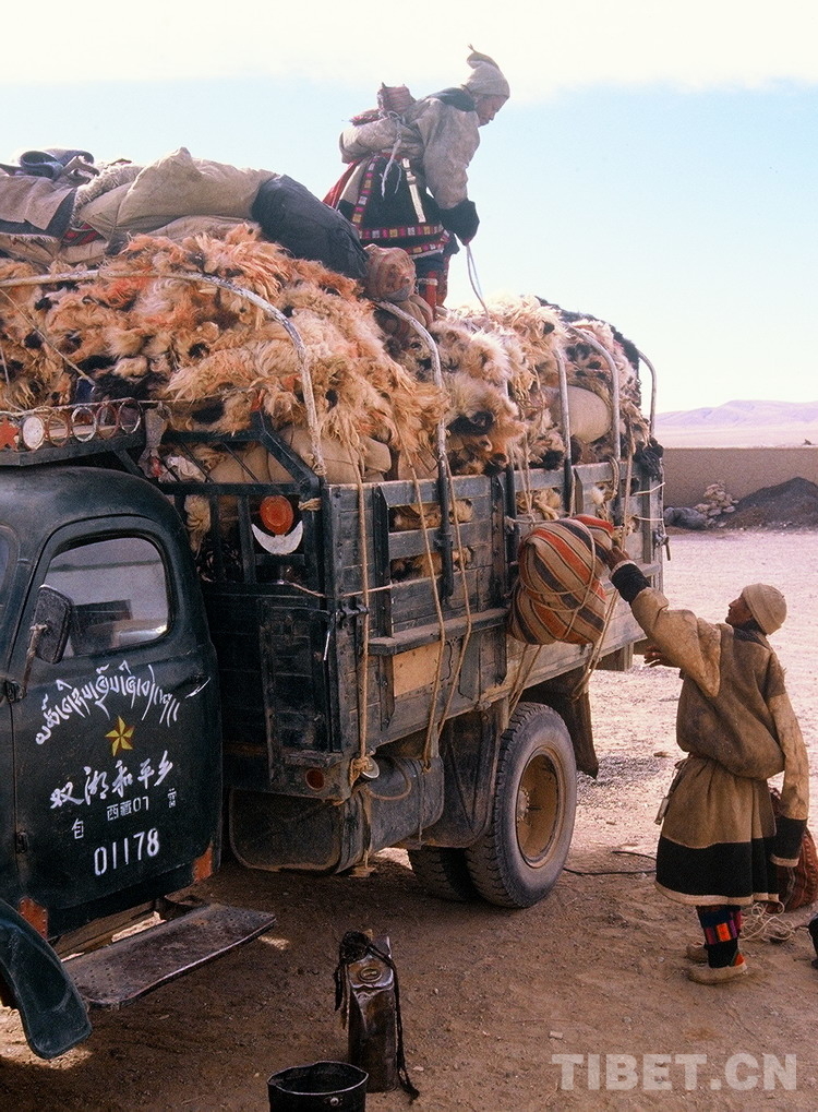 這是雙湖辦事處(現(xiàn)改為雙湖縣)和平鄉(xiāng)牧民正在裝車,通過以前的泥濘自然路外運畜產品(唐召明1987年夏攝)