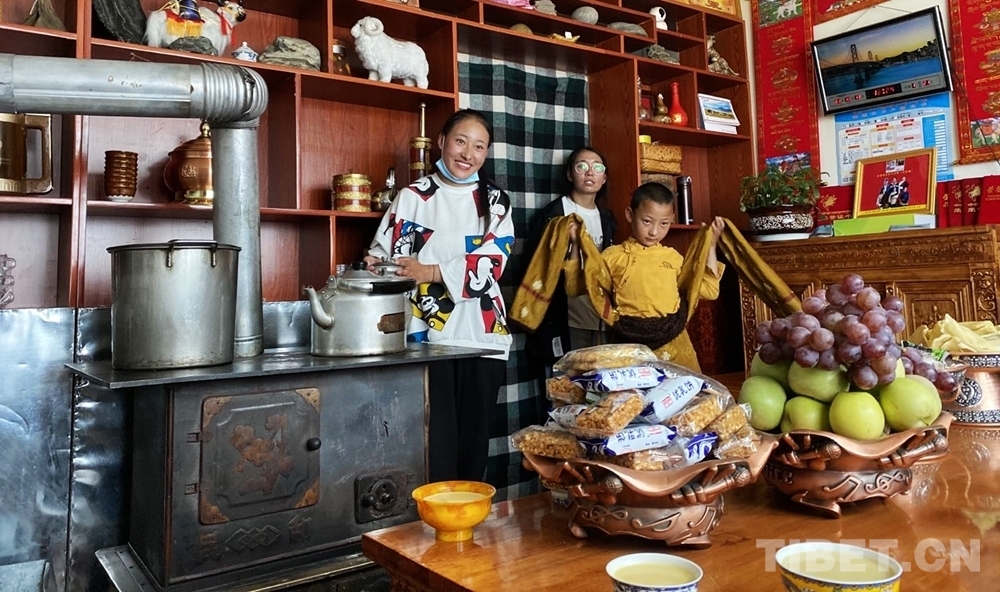 圖為西藏自治區(qū)那曲市色尼區(qū)北部易地扶貧搬遷集中安置小區(qū)里,旦增的兩個妹妹和兒子在客廳 攝影:王媛媛