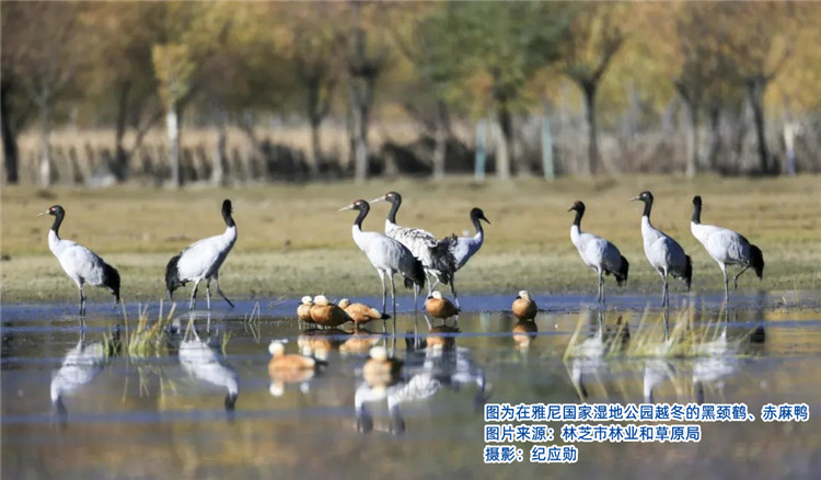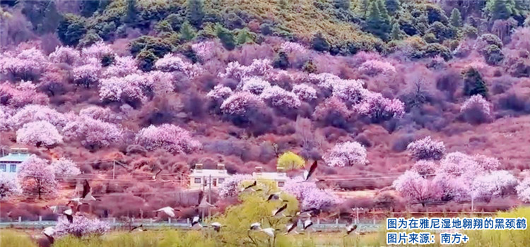 雅尼濕地生態(tài)的改善,不僅解決了困擾當?shù)厝罕姸嗄甑娘L沙問題,而且其高原濕地獨特的壯美景觀吸引了大批慕名而來的游客。這里已成為著名的林芝桃花的最佳觀賞地之一,尤其是黑頸鶴在此停留之時,正是桃花盛開之際,灼灼其華間清啼入云,桃紅緋然間鶴舞翩躚的勝景是大自然對這里的人們矢志保護生態(tài)的回饋,更是整個西藏自治區(qū)著力生態(tài)保護成效的縮影。