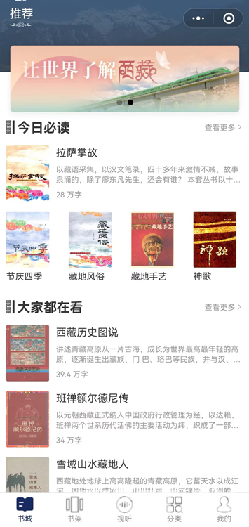 “掌讀西藏”為讀書(shū)公益類平臺(tái),免費(fèi)向讀者提供中國(guó)西藏主題的電子圖書(shū)。目前有《古格王國(guó)》《神歌》《達(dá)賴?yán)镛D(zhuǎn)世制度》《班禪額爾德尼傳》《拉薩掌故》《雪域山水藏地人》《節(jié)慶四季》《西藏歷史圖說(shuō)》《進(jìn)軍西藏日記》等29本電子圖書(shū)。這些電子圖書(shū)都是作者寶貴的知識(shí)結(jié)晶,也是對(duì)中國(guó)西藏珍貴的歷史記憶,濃縮了幾代人見(jiàn)證中國(guó)西藏發(fā)展的時(shí)代烙印。