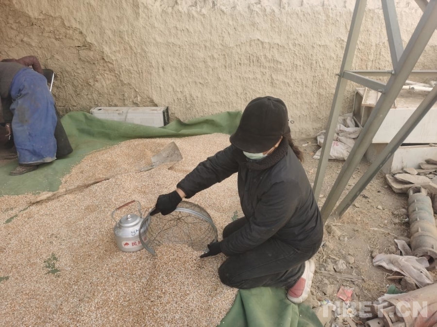圖為駐村工作隊(duì)到電磨糌粑廠幫助群眾炒青稞